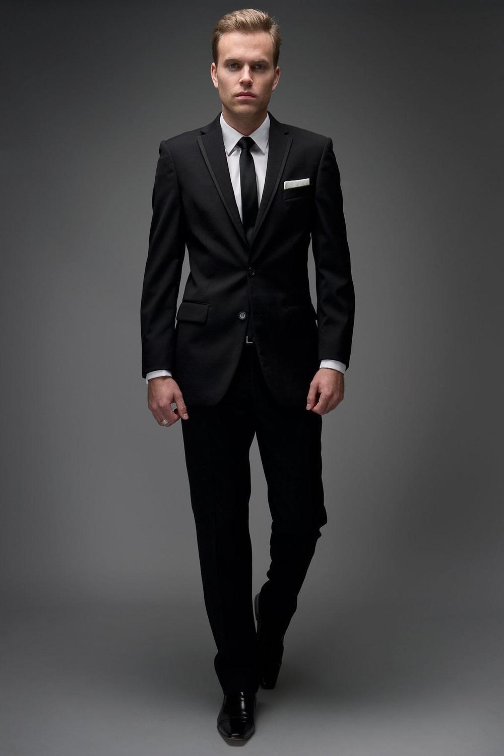 Pantalones negros. Los pantalones tienen casi siempre una raya lateral que se combina en material con el de la solapa de la chaqueta.